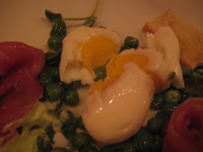 • With pea mousse, snow pea tendrils, a poached egg, two crostini, and drizzled with extra virgin olive oil.
