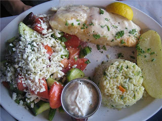 - Topped with white wine sauce. Served with Greek potato, rice, Greek salad, pita bread and tzatziki.